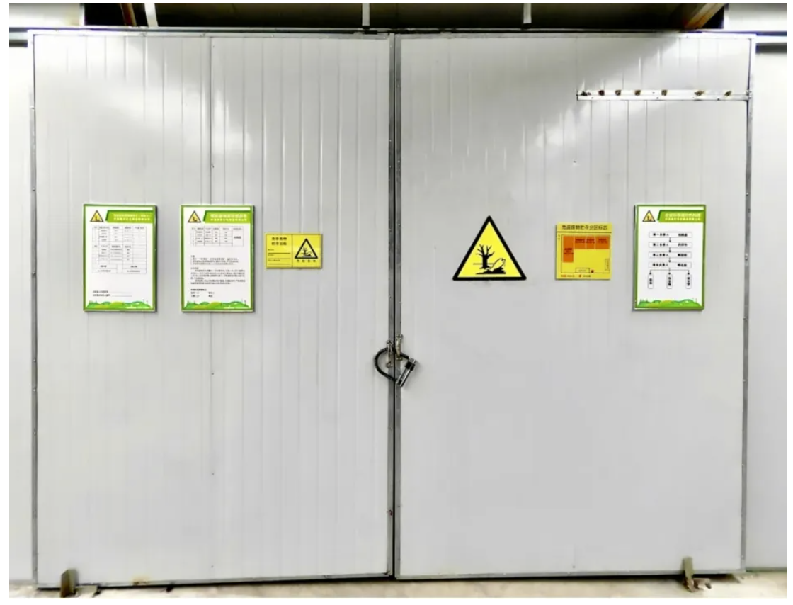 4.暂存间门外要张贴包含所有危废的贮存分区标志、危废识别标志、危废制度牌以及新版危废设施标志,暂存间内墙上张贴对应投放危废的标识牌和制度牌,无法装入常用容器的危险废物可用防漏胶袋等盛装,包装桶、袋上有标签;