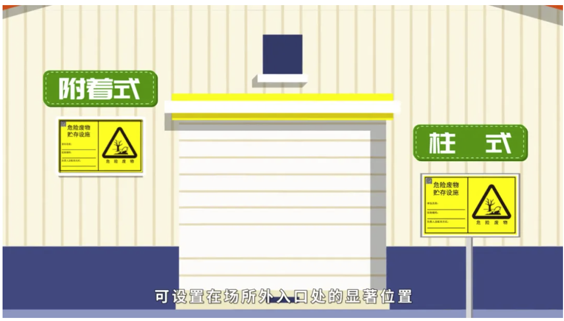 标志设置位置如有独立场所的设施,可在场所外入口处的墙壁或栏杆显著位置设置,如位于建筑物内局部区域的设施,可在其区域边界或入口处显著位置,如在危险废物填埋场等开放式设施,除了固定的入口处之外,还可根据环境管理需要在相关位置设置更多的标志,优先选择附着式,当无法选择附着式时,可选择柱式。